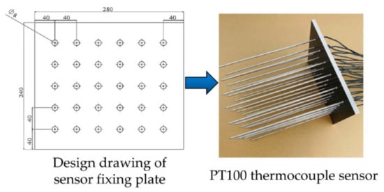 In the experiment, the soil surface temperature was measured with an infrared thermal imager, as shown in Figure 4 (Testo 865, Testo AG, Germany). A thermal sensitivity of ≤0.12 °C can achieve a 320 × 240-pixel infrared resolution. After temperature information acquisition, the data are stored as infrared images, and temperature information can be obtained after processing in Testo IR Soft software. The internal soil temperature was acquired with a high-precision PT100 thermocouple sensor (Figure 5), with a response time of 0.5 s and a measurement error range of 0.3 ± 0.005 T (T denotes the temperature value). Thirty probes containing PT100 thermocouple sensors were affixed on an aluminum plate in 5 rows and 6 columns. Each probe was 30 cm long and marked with a scale on the surface, with a diameter of 6 mm. Moreover, the tip is cone-shaped and easily inserted into the soil. The probe spacing is 40 mm, and the purpose is to avoid heat absorption by the sensor probe, which could affect the experimental results when collecting multipoint soil temperature data. The signal measured by the sensor is collected by a data acquisition card and transmitted to a computer via a 485-to-USB interface. The acquired temperature information is stored as a table in Smacq M Console V0.6 software (Beijing, China).