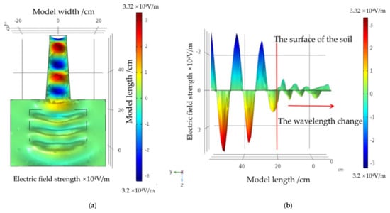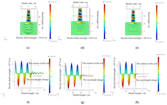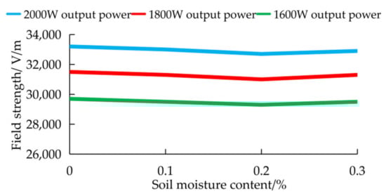 In the simulation, at microwave output power levels of 2, 1.8, and 1.6 kW, the corresponding maximum electric field value was determined, as shown in Figure 7. The electric field intensity decreased with decreasing output power, but the output power did not affect the waveform entering the water-bearing soil. After analysis of the microwaves entering the water-bearing soil, the simulation results obtained at a 2-kW microwave output power level were adopted as an example for illustration purposes.