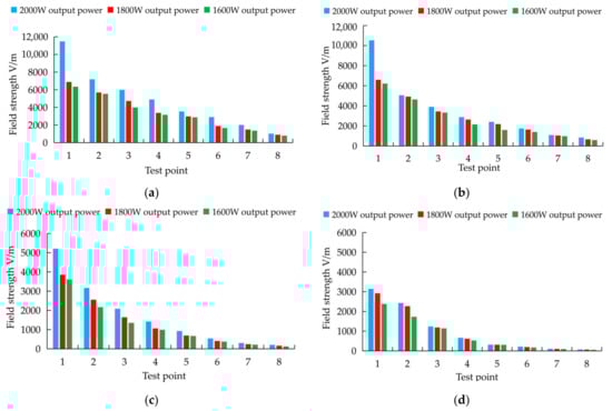 Field strength at each experimental point for the different soil moisture levels: (a) field strength at 0% soil moisture; (b) field strength at 10% soil moisture; (c) field strength at 20% soil moisture; (d) field strength at 30% soil moisture.