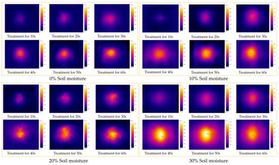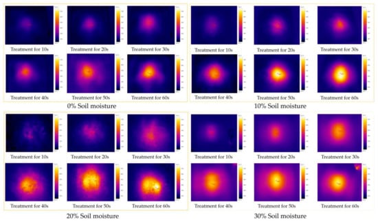 A thermal imager was employed to obtain thermal images of the soil surface after microwave treatment, as shown in Figure 10, Figure 11 and Figure 12. The soil temperature is distinguished according to the different colors of the temperature scale. The thermal imager captured soil surface temperature images at microwave output power levels of 2, 1.8, and 1.6 kW. Areas with a higher soil surface temperature appeared as circles in the thermal images, and the diameter was equivalent to the long side of the horn antenna. The highest temperature generally occurred near the centerline of the horn antenna. With increasing treatment time and microwave output power, the soil surface temperature increased, and the bright orange circular area in the image further expanded.