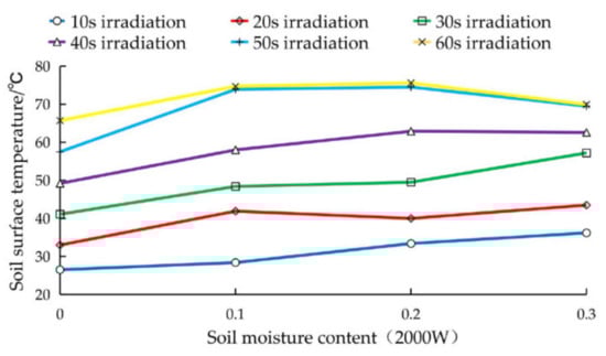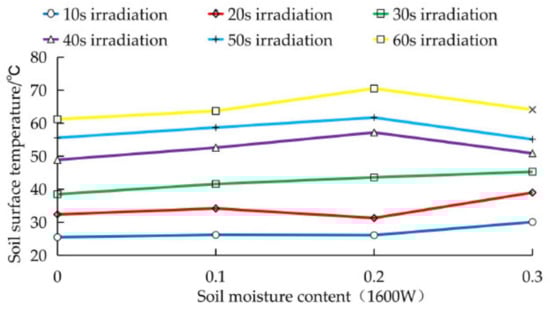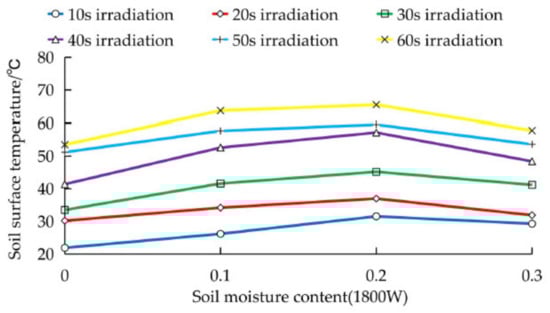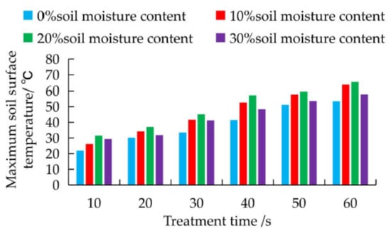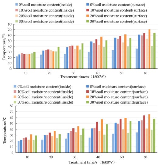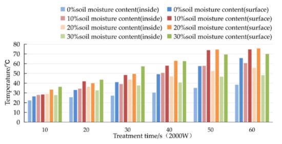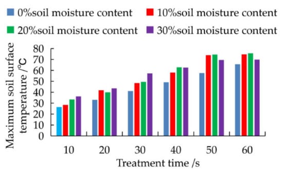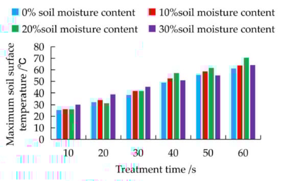 Under normal circumstances, the soil moisture content at depths from 0~200 mm is approximately 20%, and the saturated moisture content reaches 23.3%. The soil adopted in the experiment did not reach a soil moisture content higher than 30% in the field. In the experiment, the higher soil surface temperature obtained at soil moisture contents of 10% and 20% undoubtedly yielded a positive microwave soil disinfection effect.