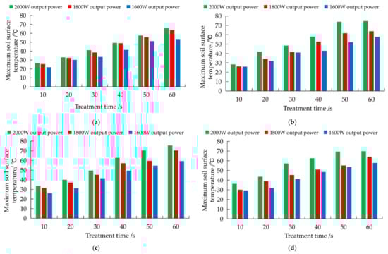 Effect of the microwave output power on the maximum soil surface temperature: (a) diagram of the treatment time and maximum soil surface temperature for a 0% soil moisture content; (b) diagram of the treatment time and maximum soil surface temperature for a 10% soil moisture content; (c) diagram of the treatment time and maximum soil surface temperature for a 20% soil moisture content; (d) diagram of the treatment time and maximum soil surface temperature for a 30% soil moisture content.