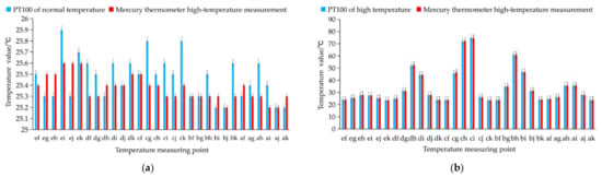 To ensure the accuracy of the results of the soil internal temperature experiments, it is necessary to verify the accuracy of the temperature data obtained with the PT100 sensor. The PT100 sensor and a mercury thermometer with an accuracy of 0.1 °C were employed to obtain the soil temperature at a depth of 3 cm with a moisture content of 10%. Under the same soil conditions, soil temperature measurements were performed at room temperature and after 2 min of microwave treatment. The results are shown in Figure 20a,b. Among the results, the average temperature based on 30 points measured with the PT100 sensor under normal soil conditions is 25.46 °C and that measured with the mercury thermometer reaches 25.37 °C. After 2 min of microwave treatment, the average temperature based on 30 points measured with the PT100 sensor is 33.97 °C, and the average temperature measured with the mercury thermometer is 34.08 °C.