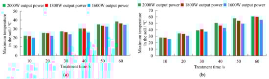 Brodie reported that the highest temperature after microwave soil treatment occurs 2~5 cm below the soil surface along the centerline of the horn antenna [30]. Through simulations and experiments of microwave soil treatment, it is found that the location of the highest soil internal temperature after microwave treatment is located 1~5 cm below the soil surface along the centerline of the horn antenna. In addition, the highest soil temperature after microwave irradiation often occurs at the soil surface and not within the soil. Even if the soil surface temperature was affected by environmental factors, the energy quickly dissipated. Figure 24 shows the maximum soil internal temperature and soil surface temperature.