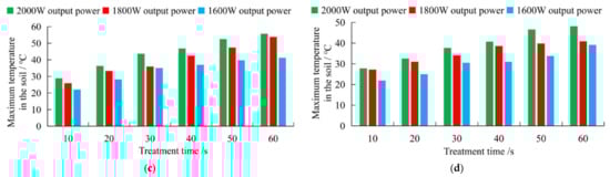 The influence of the microwave output power on the highest soil surface temperature is shown in Figure 19. In the study of the influence of the microwave output power on the soil surface temperature, this article applies the following method to compare the difference in soil surface temperature between the various output power levels: