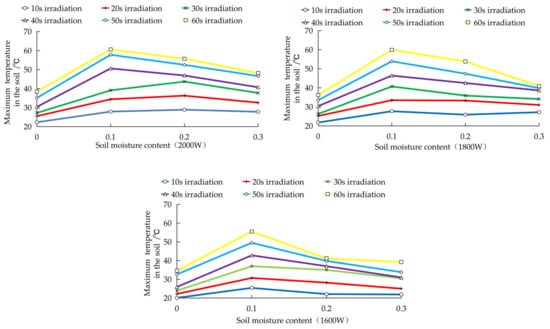 In the experiment, the maximum treatment time was 60 s, so when exploring the relationship between the maximum soil internal temperature, soil moisture content, and microwave output power, only the soil internal temperature above 10 cm was measured. The influence of the microwave treatment time on the maximum temperature inside the water-bearing soil is shown in Figure 21. In the study of the influence of the microwave output power on the soil internal temperature, the same method as that for the soil surface temperature was adopted:
