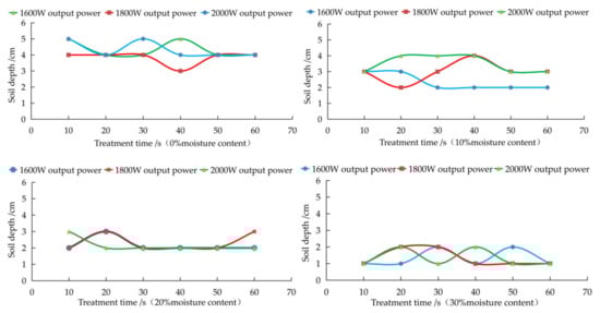 The electric field and temperature values when the microwave output power is 2.0 kW, 1.8 kW and 1.6 kW are shown in Table 7. According to the above experimental results, a change in microwave output power does not impact the location of the highest soil internal temperature, but the soil moisture content does affect the location of the maximum soil internal temperature. Notably, with increasing soil moisture content, the location of the highest soil internal temperature becomes increasingly closer to the soil surface. The soil surface temperature is higher than the soil internal temperature under the same microwave treatment conditions. Since the soil internal temperature is the main factor of pest and disease deactivation, if the soil internal temperature meets the pest deactivation conditions, the soil surface temperature also satisfies these requirements. The above conclusions are in line with the expected results of the simulations.
