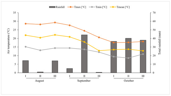 Cumulative (mm) precipitation and air temperatures (Tmax, Tmin, and Tmean) throughout the period between flowering and the harvesting of fruits. Data are reported for each decade (I, II, and III), from August to October 2016.