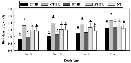 CT-BR had a greater BD compared with other treatments at a depth of 0–30 cm (Figure 1) and no significant differences in BD were observed in between ST-IR and CT-IR, between ST-BR and NT, respectively. BD in ST-BR was slightly higher than in NT, which varied from 1.16 g·cm−3 to 1.24 g·cm−3 at a depth of 0–30 cm. In the top soil of 0–10 cm, the BD values in ST-IR and CT-IR had a significantly lower value than ST-BR and NT, and the differences in BD among these treatments decreased with the increase in soil depth.
