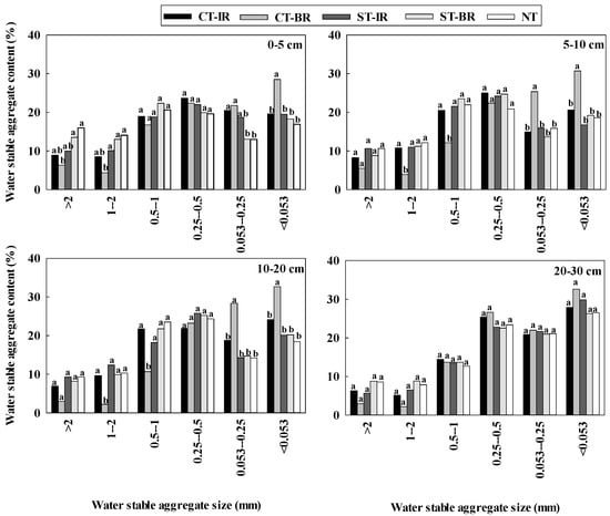 At a depth of 0–5 cm, the greatest proportion of soil in both ST-BR and NT was observed in the 0.5–1 mm size fraction and the main proportion of soil in ST, NT, and CT-IR was in the 0.25–0.5 mm size fraction at the depth of 5–20 cm (Figure 2). The greatest < 0.053 mm size fraction was observed in CT-BR at a depth of 0–30 cm and in other treatments at a depth of 20–30 cm.