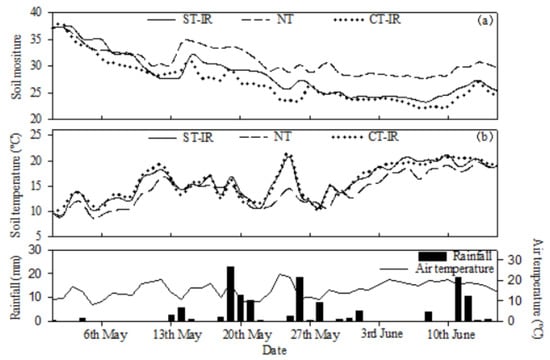 The average soil moisture at a depth of 0–10 cm in ST-IR was 2.77% lower than in NT and 1.21% higher than in CT-IR during the seed emergence period (Figure 3a). Greater temporal variation was observed in ST-IR and CT-IR compared to NT. The results showed that soil moisture in both ST-IR and CT-IR decreased by 6.37% and 5.72% respectively, from 6 to 11 May, while that of NT decreased by 3.51%. The average soil temperature at a depth of 10 cm in ST-IR and CT-IR was 1.64 °C and 1.80 °C greater than in NT, respectively (Figure 3b). This study also observed similar variation of soil temperature in ST-IR and CT-IR, and their changes, which fluctuated with air temperature, were greater than NT. From 22 to 24 May, the average daily air temperature increased from 9.63 °C to 22.98 °C and the average daily soil temperature in ST-IR, CT-IR and NT increased by 6.99 °C, 6.80 °C and 2.24 °C, respectively. While from 25 to 26 May, the mean daily air temperature decreased rapidly from 21.52 °C to 11.17 °C, and the mean daily soil temperature in ST-IR, CT-IR and NT decreased by 6.98 °C, 7.13 °C and 2.19 °C, respectively. However, the mean daily soil temperature in both ST-IR and CT-IR were 1.39 °C and 1.94 °C, respectively.