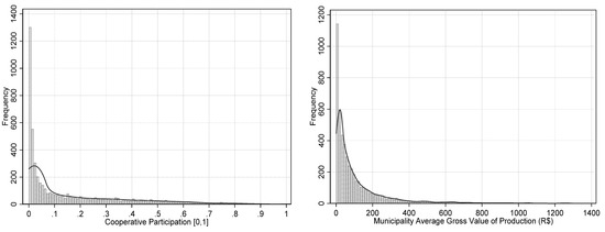 As of 2017, only 11.4% of Brazilian farms are associated with cooperatives. Figure 1 (left graph) shows the histogram of the MSCM. Most municipalities have low MSCM—indeed, almost one-third of the municipalities has a share equal to or less than 1%.