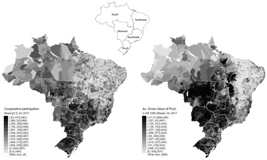 Historically, cooperatives in rural areas have been encouraged by the Brazilian government. Several articles of the Brazilian Constitution establish that the government is to encourage the creation of cooperatives; indeed, the law that regulates the operation of cooperatives highlights the role of the government in encouraging their development (Law no. 5764 of 16 December 1971 is known as the Brazilian Cooperative Law. Based on this law, the National Cooperative Policy was defined, and the legal regime of cooperative societies was instituted, in addition to other measures). In 2017, the municipality share of cooperative membership (MSCM) (The municipality share of cooperative membership (MSCM) is the ratio of farms associated with a cooperative in a municipality compared to all farms in this same municipality) was 11.42%, according to IBGE [19] data (see Table 1). Even though the number of farms is greater in the Northeastern region—home to 45% of all Brazilian farms—their contribution to the national gross value of production (11.58%) is far less than in the South (26.41%), Southeast (28.23%) and Midwest (27.07%). The number of farms associated with a cooperative follows a similar pattern, constituting almost 37% of all farms in the South. Despite these disparities, nearly 578,000 Brazilian farms are associated with a cooperative, which suggests that cooperatives may be positively related to the national gross value of production and still have room to grow (For a more comprehensive view of the heterogeneities of the Brazilian rural environment, cf. [1,20]. The paper by Neves et al. [21] conducts an initial analysis of the heterogeneity of Brazilian cooperativism in its different regions).