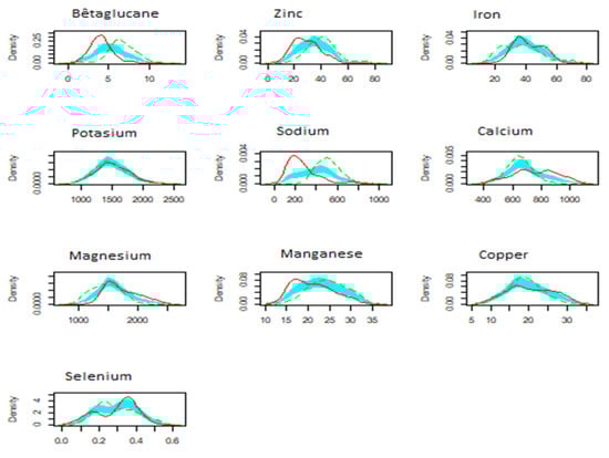 Based on the scores of the first and second principal components of PCA considering all measured parameters, the wild bulked seed accessions clustered separately from the entries of cultivated barley (elite germplasm and cultivars) (Figure 1). These comparisons between the accessions of Hordeum spontaneum with entries of cultivated barley for each of the traits are highlighted by the plots of density distributions showing clear differences between the two groups for β-glucan, Zinc, and Sodium contents (Figure 2). For the cultivars and elite germplasm, the averages were lower for β-glucan and for Zinc and Sodium contents compared with the entries from the wild barley samples, but their contents for Magnesium and Calcium were higher (Table 5). For β-glucan, only the cultivar Chifaa had a maximum content of 7.81% followed by the elite lines BL 12 (6.21%), BL 9 (5.66%), and the cultivars ACSAD 176 (5.89%) and Tamellalet (5.43%) (Appendix B). For Iron content, four accessions had levels above 50 ppm, while 8 out of 36 breeding lines and released cultivars had levels ranging from 50.32 ppm for Arabi Abiad to 56.35 ppm for the cultivar Laanaceur. For Zinc, the cultivars Taffa and Azara had the highest contents of 46.92 ppm and 46.53 ppm respectively, exceeding any of the wild accessions. For Selenium, the cultivars Rabat 071 and Tissa showed the highest content of 0.45 ppm.