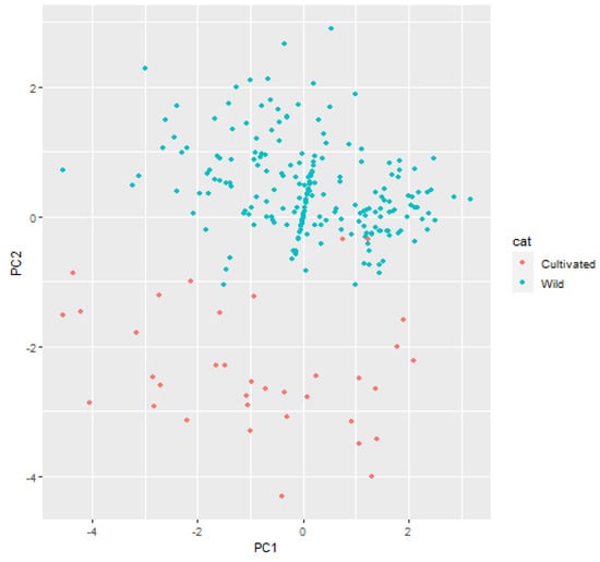 PCA analysis score plot on the first and second principal components (PC1 and PC2) for distribution of Hordeum spontaneum bulked seed accessions with elite germplasm and cultivars of cultivated barley based on β-glucan and microelements contents.