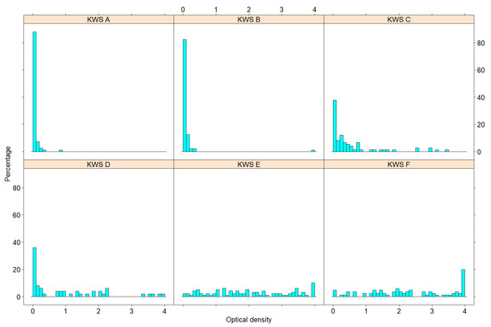 Figure 1 displays the data distribution for every genotype as histograms. Due to the technical limits of the ELISA machine, OD values are limited to the interval between 0 and 4. None of the data distributions seem to follow a normal distribution. All resistant genotypes show a right-skewed data distribution. The genotype KWS A shows the smallest central tendency of ODs and the highest degree of skewness. Despite their classification as resistant genotypes, KWS C and KWS D show a substantial fraction of high OD values. Similarly, KWS E and KWS F show OD values that are almost uniformly distributed across the whole interval.