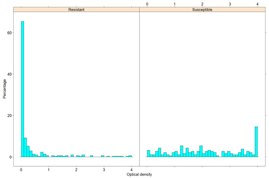 Histograms of optical density (OD) values for the two pools of resistant (left) and susceptible (right) genotypes. The X axis represents OD values in the range from 0 to 4 with a binning width of 0.1. The Y axis represents percentage of measurements in each bin.