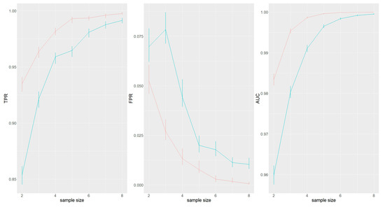 Figure 4 displays the TPR, FPR and AUC for each sample size with the average OD and Bayes factor as predictors. One can see that for each of the analysed sample sizes the TPR value based upon the Bayes factor is greater than the TPR value based upon the average OD as predictor. Analogously, the FPR based upon the Bayes factor is smaller for each sample size. Moreover, the AUC values based upon the Bayes factor is higher than the AUC based upon the average OD for each sample size. At a sample size of six, the AUC value based upon the Bayes factor as predictor has practically converged to one.