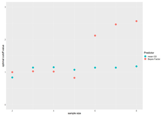 Figure 5 shows the optimal cutoff values for the mean OD and the Bayes factor for the sample sizes under investigation. The optimal cutoff values for the mean OD are relatively stable at around one as one also might have estimated from the distributions for the resistant and the susceptible pool shown in Figure 2. Values between 0.6 and 1.0 appear to be a good choice since an overwhelming fraction of all measurements from the resistant pool are below this range. The optimal cutoff for the Bayes factor is also in the range of one for samples sizes two to five, as one might expect given the theoretical value is 1.0. The divergent values for samples sizes six to eight ranging from 2 to 2.5 are less obvious. Plotting TPR against possible cutoff values between 1 and 10 revealed that they were above 0.99 in this range, such that the decision of the algorithm might depend on tiny numerical effects. The choice of the theoretical value of one as the optimal cutoff for Bayes factors, thus, seems to be justified also for practical purposes such that an ROC analysis does not seem to be absolutely necessary if one chooses Bayes factors as predictors.