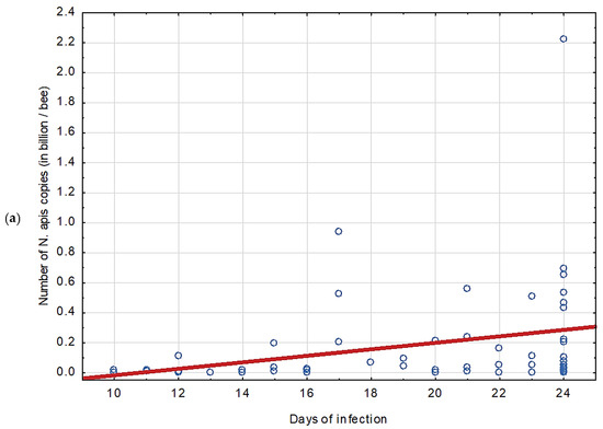A multivariate scatter Graph was used to determine the nature of change in N. apis and N. ceranae copy numbers. Single variation scatter Graphs were also used to compare the overtime change between bees with single N. ceranae and N. apis infections, but also to compare the overtime differences in cDNA copy number changes of BQCV in bees with N. ceranae and N. apis.