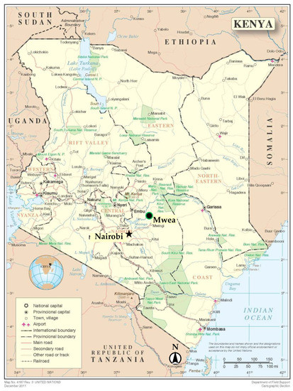 - Kenyan National Bureau of Statistics, Government of Kenya. Volume II: Distribution of Population by Administrative Units, 2019 Kenya Population and Housing Census; Kenyan National Bureau of Statistics, Government of Kenya: Nairobi, Kenya, 2019.