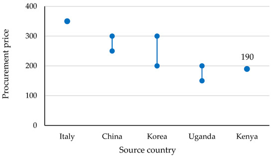 Figure 2 shows the price of japonica rice purchased by each store from each souring country. The prices were 150–200 KSh/kg (1.4–1.9 USD/kg), 200–300 KSh/kg (1.9–2.9 USD/kg), and 250–300 KSh/kg (2.4–2.9 USD/kg) for Uganda, Korea, and China, respectively, and the procurement prices varied from store to store and even within the same store. Imported rice from the neighboring country of Uganda was occasionally cheaper than locally grown japonica rice. One respondent answered that the procurement price was 150 KSh/kg (1.4 USD/kg), whereas others answered that it was 200 KSh/kg (1.9 USD/kg). Ugandan rice was the cheapest at 150 KSh/kg (1.4 USD/kg), followed by locally grown japonica rice.