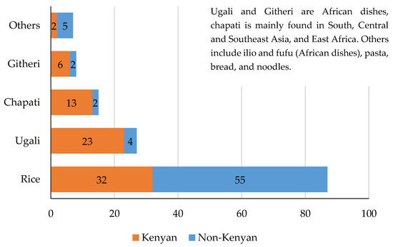Figure 3 lists the staple foods eaten by the respondents (multiple responses). Of the 122 respondents, 71% (87) cited rice as a staple food (hereafter, rice group), indicating that it is widely consumed by Kenyans, non-Kenyan Africans, Europeans, Asians, Indians, and Arabs. The number of respondents who answered “rice” greatly exceeded those who answered “Ugali” (corn flour kneaded with hot water) [32], which is a traditional staple food, as well as Chapati and Githeri, which are eaten in East Africa. This suggests that the custom of eating rice is widespread among the middle and affluent classes in Nairobi. Among the 87 respondents in the rice group, 32 were Kenyans, about 1.4 times as many as the 23 who ate Ugali as a staple food. This indicates that middle-class and affluent Kenyans are shifting from traditional staple foods to rice.