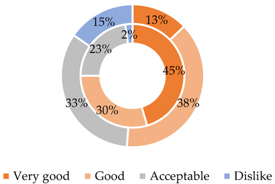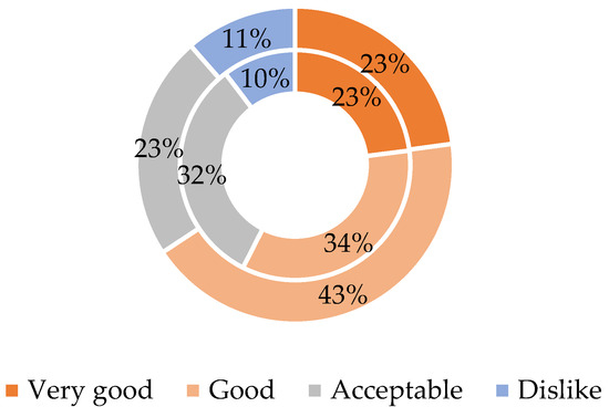 Figure 6 summarizes the tasting evaluation of this rice according to the differences in the experience of eating Japanese food. The “very good” rating was selected by 45% of those who had eaten Japanese food, while only 13% of those who had not eaten Japanese food rated it as “very good”, a difference of 32%. The former group was more likely to have a high opinion of this rice. In terms of the favorable evaluations of “very good” and “good”, 75% of those in the first group and only 51% of those in the latter group had a favorable evaluation. Even among those in the second group, about half of them gave a favorable evaluation of this rice.