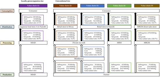 Next, we determined the net profit (KSh/kg) and value-added ratio (%) of each stakeholder in the above value chains (1) to (5), which were calculated using the value chain analysis shown in Figure 7. In cases where there were multiple selling prices, such as with or without bagging, the average value was used. Costs for middlemen, millers, and retailers were taken from Ndirangu et al. [3]. The cost of the direct sales outlet at the MRGM was determined as the sum of the costs of the miller and the retailer. The selling price of unprocessed rice at MIAD for locally grown japonica rice was 90 KSh/kg (0.9 USD/kg), and the selling price of milled rice was 170 KSh/kg (1.6 USD/kg). The milled rice sale price included the transportation cost from MIAD to Japanese food store A in Nairobi. The selling price of conventional rice by farmers to middlemen was 55 KSh/kg (0.5 USD/kg), while it was 65 KSh/kg (0.6 USD/kg) for sales by middlemen to private millers and 115 KSh/kg (1.1 USD/kg) for sales by private millers to retailers. The production cost of locally grown japonica rice (S1 type) at MIAD was 28.75 KSh/kg (0.3 USD/kg), while the production cost of conventional rice for farmers was 22.63 KSh/kg (0.2 USD/kg) [11]. The average unit yield of conventional rice was 6.07 tons/ha in Kenya in 2017 [4]. In value chain (4), we added 1 KSh/kg (0.01 USD/kg) to the production cost of farmers because the farmers paid 1 KSh/kg (0.01 USD/kg) to transporters as a transportation cost for delivery to the MRM.