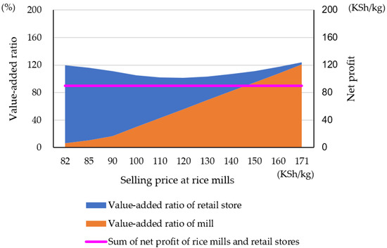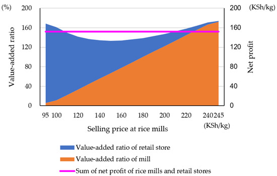 Changes in the sum of the value-added ratios of rice mills and retail stores. The selling prices of the producer and retail stores were 77 and 175 KSh/kg, respectively.