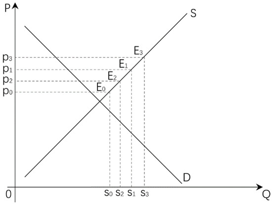 Using the classical theory of supply and demand, the target price of cotton production can be analyzed [50]. Figure 1 shows the influence of cotton target price on cotton production after the cancellation of temporary purchase and storage policy of cotton, where the ordinate is cotton’s price, the abscissa is cotton’s production, curve S is the supply curve, and curve D is the demand curve. Firstly, under the policy of temporary purchase and storage of cotton, it is assumed that P1 is the temporary purchase and storage price of cotton established by the state, and P0 is the actual transaction price between cotton farmers and cotton purchasers. In practice, due to traffic and transportation costs, most cotton farmers do not directly sell cotton to cotton-processing companies but to cotton purchasers, and cotton purchasers sell cotton to cotton-processing companies; the price is deducted for reasons such as impurities and moisture. Therefore, cotton merchants acquire cotton on the premise of maintaining profit, and cotton farmers buy cotton at prices lower than those of the reserve price. As such, the reserve price P1 is greater than the actual cotton sales price P0. When there is no temporary cotton purchase and storage policy, the supply curve point E0 corresponding to P0 and the projected point S0 on the abscissa is the supply level of P0. When the policy of temporary purchase and storage price of cotton is implemented, the price of cotton rises from P0 to P1. In this period, the profit generated by the difference between the temporary purchase and storage price and the actual transaction price will accrue to the cotton buyer and not to the cotton farmer. Subsequent to the implementation of the target price policy, it is assumed that the target price is equal to the temporary purchase and storage price. In other words, the target price policy is still P1. The income of cotton farmers changes based on the method adopted by the government to provide a subsidy, from the original subsidy, purchasing enterprises, direct subsidy, and finally, producers. At this point, the income of cotton farmers from selling cotton flowers is not less than the income from selling cotton flowers at the price of P1, and the corresponding supply level is S1. Therefore, in comparison to the implementation of the target price policy, the temporary purchase and storage policy provides more benefits to cotton farmers and increases their enthusiasm for cotton production, thereby increasing the supply of cotton.