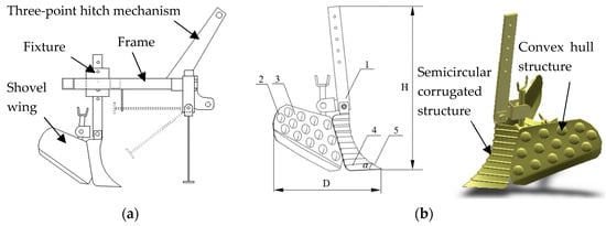 As shown in Figure 1a, the soil cultivator mainly includes the shovel wing, a three-point hitch mechanism, the frame, and the fixture. The shovel wing is the most important working part, playing the role of enabling soil loosening and ridge cultivation. The soil fragmentation rate is used to evaluate the quality of the performance, and the traction resistance of a soil contact part is a common subject of research. Hence, in this study, we designed a textured shovel wing to reduce the traction resistance and increase the soil fragmentation rate, thereby improving the quality of cultivation.
