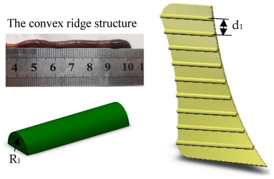 The convex ridge structure of the earthworm body surface can enable improved reduction of viscosity and resistance in the soil [,]. Measurement shows that the distance between the ribs and grooves of the earthworm is 1.5 mm under static conditions, and the convex ridge structure has been simplified to a semicircular corrugation, with a cross-sectional radius R1 = 3 mm and a distance between corrugations d1 = 15 mm, as shown in Figure 2.