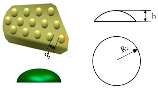 The papillary structure of rose petal surface can increase its capacity for water adhesion, which is also considered to increase the soil fragmentation rate. The convex hull structure was used for the surface of the wing plate, with a diameter R2 = 32 mm, a height h = 9.6 mm, and a distance d2 = 30 mm, as shown in Figure 3.