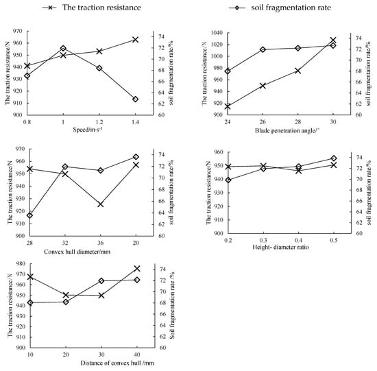 According to the previous analysis, the factors that affected the quality of the soil cultivator with a textured shovel wing mainly included speed, blade penetration angle, convex hull diameter, height–diameter ratio, and distance. The basic working and structural parameters of the single-factor simulation test research were a speed of 1.0 m/s, a blade penetration angle of 26°, a convex hull height–diameter ratio of 0.3, a convex hull distance of 30 mm, and a convex hull diameter of 32 mm. The significance of various factors with regard to the traction resistance and soil fragmentation rate were investigated, providing the basis for the orthogonal experiment to obtain the optimal parameter combination.