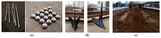 Before the test, the soil in the digital soil trough was prepared as shown in Figure 6c, and the ridge shape of the structure was sprinkled and compacted. The average soil moisture content of the 0–20 cm tillage layer in the soil trench was 21.77% (w. b.), the soil compactness was 841 kPa, and the soil bulk density was 1.12 g/cm3, which are values found in clay soil. Figure 6a shows the processed semicircular corrugated structure and the convex hull structure. As shown in Figure 6b, a traditional soil cultivator and a soil cultivator with a textured shovel wing were manufactured.