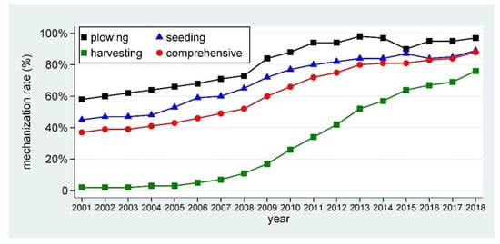 As agricultural mechanization develops, farm machinery is gradually playing an important role in replacing manual labor and draft animals (e.g., horses, oxen, mules) and improving agricultural productivity. The economic benefits of machinery use, however, depend highly on economies of scale [,,]. Farmers can use agricultural machinery by purchasing, renting, or buying machinery services []. China, known as the second largest maize producer in the world [], has adopted agricultural machinery in plowing, seeding, and harvesting for a long time. Figure 1 indicates the growth trend of mechanization in China’s maize production at the national level. Mechanical plowing and mechanical seeding are well developed, while mechanical harvesting lags a little behind compared with them. In 2018, the average maize comprehensive mechanization rate was 88.31% in all production regions of China [].
