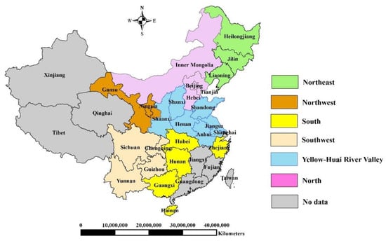 To compare regional heterogeneity, farm households were grouped together based on agroecological maize regions in China [] (Figure 2): 1032 farms (24.78%), 754 farms (18.10%), 533 farms (12.80%), 1247 farms (29.94%), 229 farms (5.50%), and 370 farms (8.88%) are located in the Southwest, Northeast, North, Yellow-Huai River Valley, Northwest, and South respectively.