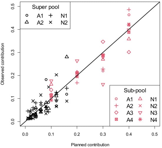 Our experimental design resulted in pools with a broad range of sample contributions ranging from 1 to 40% (Figure 1; Table A1 and Table A2). Furthermore, there was planned proportionality in sample representation that was constant between sub-pools and super pools, allowing us to evaluate the stability of proportionality estimates at different dilutions. Discrepancy from proportionality would indicate instability of pool composition, changes in real animal proportions over time, or technical error. Realized or observed animal contributions were estimated from Illumina θ []. Illumina θ for super pools and sub-pools was computed by 2 * tan−1(Y/X)/π where X is the red intensity identifying the ‘A’ allele and Y is the green intensity representing the ‘B’ allele, using the Illumina AB nomenclature []. We term pooling error sources as ‘pool construction’ (estimated DNA quantity does not match planned quantity), ‘technical error’ (caused by variation in Illumina θ within genotype or pools with the same animal representation or replicated arrays of the same pool construction), and error in estimating animal contributions. All 32 animals, eight sub-pools, and four super pools were genotyped using the Illumina BovineHD array (Illumina, Inc., San Diego, CA, USA) by Neogen Corporation (Lincoln, NE, USA).
