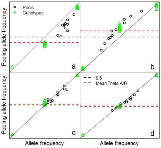 Technical error expressed as deviations of observed pooling allele frequency from allele frequency. All vertical and horizontal coordinates in this figure range from 0 to 1. Pooling allele frequency was estimated as Illumina θ = 2 * tan−1(Y/X)/π in this study where Y/X is the allelic ratio for green/red intensity for both pools and individuals. Considering pooling allele frequency for individuals is not ridiculous, because individuals are technically a pool of two haplotypes with equal representation. Technical error varies within and between SNP, and we present four examples, (a–d). (a) Pooling allele frequency was low compared to allele frequency for both pools and heterozygotes which was consistent with low mean Illumina θ for heterozygotes (depicted A/B in figure legend. (b) Pooling allele frequency and mean heterozygote Illumina θ were high compared to allele frequency. (c,d) Pooling allele frequency and mean heterozygote Illumina θ were similar to allele frequency.