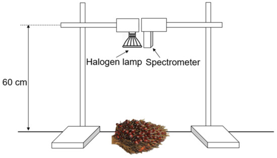Based on the standards established by the Malaysia Palm Oil Board (MPOB), the oil palm FFB can be classified into unripe, ripe, and overripe by referring to the number of empty sockets on the bunch. When the bunch ripens, its fruit will detach from the bunch, resulting in an empty socket. If there are 1–9 empty sockets, the bunch is classified as an unripe class. If there are 10–50% empty sockets on the bunch, it is classified as a ripe class. Lastly, if there are more than 50% empty sockets on the bunch, it is classified as an overripe class. The details can be found in Table 4. Each FFB sample was scanned using the halogen lamp and spectrometer. The scanning step focused on five parts on the FFBs, which are the apical, front equatorial, back equatorial, front basil, and back basil (as shown in Figure 3). The target part to be scanned was put under the spectrometer and halogen lamp and the system was controlled on the personal computer. In the SpectraSmart software, the number of readings was set to “Average”. Once the reading on the graph was stable, the data was saved.