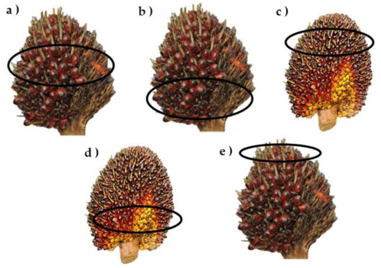 Five different parts of FFB: (a) front equatorial; (b) front basil; (c) back equatorial; (d) back basil; (e) apical.