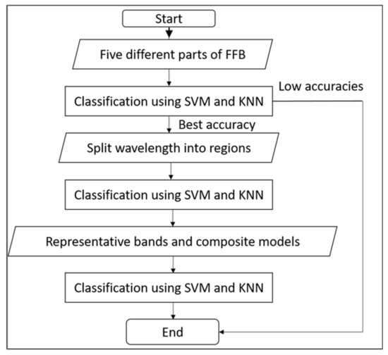 There were three classifications done in this analysis. In the first case, the pure reflectance collected from the FFB from 180 to 1100 nm was used as the input to the classifiers. Then, the bands from UV (180–400 nm), Blue (450–490 nm), Green (500–570 nm), Red (630–700 nm), and NIR (800–1100 nm) regions were used in the classifiers. Lastly, we selected specific bands from the pure reflectance data of FFB according to Dayaf’s [15] work, where the bands 365 (UV), 460 (blue), 523 (green), 590 (amber), 623 (red), 660 (deep red), 735 (far-red), and 850 (near-infrared (NIR)) nm were chosen as the input for the classification The classification process was illustrated in Figure 4.
