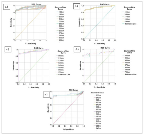 The ROC curve was drawn to test the accuracy performance of each region. Figure 6a shows the ROC curve of the UV bands. The mean AUC is 0.922 with a 95% confidence interval. The highest AUC value is contributed by the 350 nm curve with a value of 0.959, and the lowest AUC value comes from the 210 nm curve with a value of 0.889. The mean lower bound is 0.849, while the upper bound is 0.995.