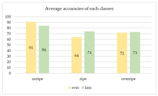 The average accuracy of KNN is 79.2%, whereas the average accuracy of SVM is 75.5%. This shows that KNN has a better performance than SVM. Meanwhile, Figure 7 shows the comparison between the average accuracies of three maturity levels. The unripe class has better average accuracies compared to the other classes.