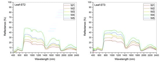 Due to the lack of a leaf spectrum in the vegetative growth stage (ST1), the leaf spectral characteristics at the tasseling-silking stage (ST2) and maturity stage (ST3) were analyzed. As shown in Figure 3, in the above two growth stages, the leaf spectral characteristics of summer maize under all treatments were largely similar. However, differences still existed, especially in the water-sensitive band around 1450 nm. The vegetation reflectance spectrum showed a decreasing feature due to leaf water content [] and formed the water absorption depth and area. This absorption depth and area between different treatments presented the following order: W4 > W5 > W3 > W2 > W1. This phenomenon was consistent with the previous study [], because the absorption depth and the area of leaf spectrum at 1450 nm were used to diagnose the leaf water content, and the two parameters are proportional to the leaf water content [,]. In addition, as can be seen from the near-infrared reflectance (NIR) band, the leaf reflectance of summer maize under different treatments is also displayed in the same order, and the difference between the leaf spectral characteristics under different treatments was small. However, the two measurements in the visible band were inconsistent with the chlorophyll content in the previous study []. This may be caused by the light source problem during the observation and leaf curl. Therefore, our study demonstrated that the physical and chemical parameters of summer maize under different water treatments used in the radiation transfer model (Prospect) were reliable [,]. Thus, the leaf spectral reflectance under different treatments was then simulated.