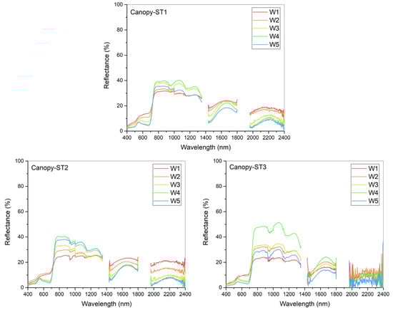 As shown in Figure 4, the canopy spectral characteristics of summer maize at different growth stages and under different treatments are basically similar. The reflectivity under all treatments was higher in the green band and lower in the blue and red bands under the visible band. Among these, the reflectivity under W4 and W5 treatments was significantly lower than that of other treatments, which was mainly due to the higher chlorophyll concentration [,]. Water stress is one of the major environmental stressors that significantly and systematically affects the crop, damages the photosynthetic membrane, and reduces the chlorophyll content [,]. However, the reflectance in the visible band can be attributed to a change in chlorophyll content. The reflectance is highly related to the water level in the visible band, where pigments are absorbed maximally. This is consistent with the conclusion drawn by Zygielbaum et al. []. Furthermore, due to the lower LAI under W1 and W2 treatments, the reflectance of W1 and W2 treatments was increased significantly, especially in the red band. In the ST3 stage, however, the reflectivity of W3 and W5 treatments in the visible band were both lower than that of the W4 treatment, which may be caused by the problem of the measurement points selected by the W4 treatment and the lower LAI of W5, so that the waterlogging surface features were captured. In the red band, it is difficult to distinguish the differences between different treatments, and methods such as the Gaussian model [,], polynomial function model, a differential technique [], or interpolation method [] should be used to extract them. In the near-infrared reflection band, because the reflectance here mainly depends on leaf structure and LAI, the canopy reflectance of W4 in this band is higher than that of other treatments, whereas W1 is significantly lower than other treatments. This phenomenon is consistent with Feng et al. [], who pointed out that the reflectance of maize under drought stress is obviously lower than that of the contrast group in the 780–1350 nm high-reflecting region of the near-infrared band. From the band after 1350 nm, the value of reflectivity is basically consistent with the water treatment gradient. Moreover, in ST3, the reflectivity in the near-infrared region under water stress and W4 treatment showed the largest difference. The above phenomenon may be explained by the fact that the stress accumulated for the longest time in this stage, and saw the largest LAI difference caused by drought and mild waterlogging, which inhibited the internal structure and chlorophyll content to different degrees.