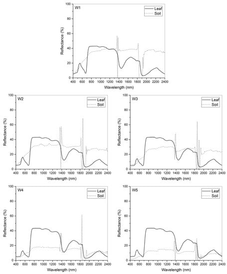 According to Table 2, the leaf and soil reflectance under continuous water stresses are calculated and presented in Figure 5. As seen in Figure 5, the highest difference in leaf reflectance among different water stresses of summer maize was shown in the visible spectrum band, followed by the reflectance in the short-wave infrared band. Based on the study of predecessors, the absorption depth and area in the water-sensitive spectrum (around 1450 nm) were positively correlated with leaf water content and were also recommended to diagnose the leaf water condition [,]. As shown in Figure 3, the absorption depth and area in 1450 nm showed the following trend: W4 > W5 > W3 > W2 > W1. This trend is consistent with the leaf water content. In addition, a similar trend was also found in the near-infrared spectrum reflectance. Furthermore, the difference in the soil reflectance among each water treatment is evident. The soil reflectance follows the order of decreasing trend: W1 > W2 > W3 > W4 > W5, which is closely related to the soil water treatment level. Therefore, the reflectance in canopy level under different water stresses will be distinct from that in the leaf level, considering the soil background differences.