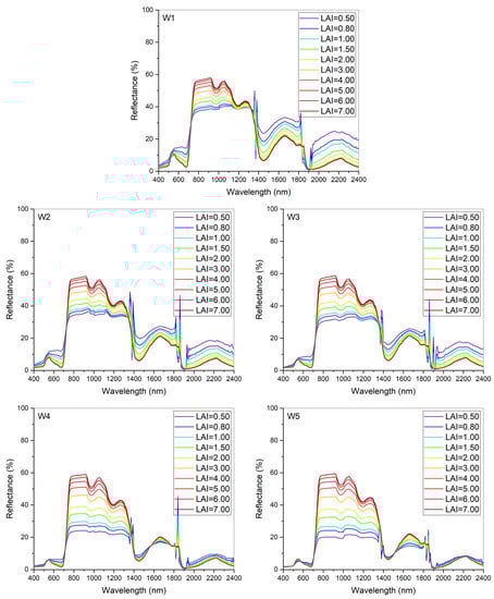 In the visible band, as LAI increased, the reflectance of each treatment gradually decreased, especially in the drought treatments (W1, W2 and W3). However, when LAI was greater than 4, the reflectance of this band reached saturation, and the reflectance in the green band showed a trend of W1 > W2 > W3 > W5 > W4, which was consistent with the trend of chlorophyll content []. With the increase in soil moisture, the reflectance difference caused by different LAI decreased, especially in the red band. This phenomenon is mainly due to the canopy spectrum in this band being influenced by both the characteristics of leaf and soil. The reflectance of this band decreased gradually with the increase in soil moisture content. In addition, due to the strong absorption of chlorophyll, this band also belongs to the low reflectance region. Therefore, when the soil moisture was relatively high, the reflectance of this band was relatively low, whether LAI was high or low. On the contrary, the reflectance at the red band is relatively high, and when LAI is small, the canopy reflectance is greatly affected by the soil reflectance and is also relatively high.
