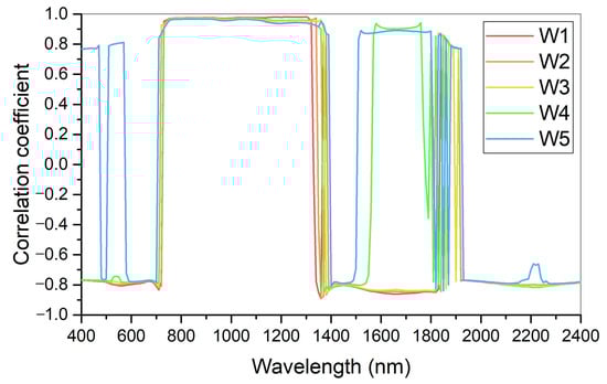 Further, from Figure 6, the canopy spectral reflectance changed with LAI in different treatments, especially in visible and short-wave infrared bands. We investigated the quantitative relationship between LAI and the canopy spectral reflectance by introducing the correlation coefficient. In Figure 7, the correlation coefficient was negative for all treatments except for W5 in the visible band. The average correlation coefficient values in the visible band were −0.79, −0.78, −0.78, −0.77, and −0.02 for W1, W2, W3, W4, and W5, respectively. The abnormal value of W5 may be due to the mild flooding treatment. In the near-infrared reflectance band, correlation coefficient values were the highest among all bands; the specific average correlation coefficient values were 0.98, 0.97 0.97, 0.97, and 0.96 for W1, W2, W3, W4, and W5, respectively. Xiao et al. [] also discovered that the LAI was the dominant factor of canopy reflectance variation in the near-infrared reflectance band. He et al. [] and Dian et al. [] also suggested the canopy reflectance varied distinctly with LAI in the near-infrared reflectance band. Previous research found negative correlations between canopy reflectance and LAI at 1400–1800 nm [,]. Moreover, in our research, negative correlations between canopy reflectance and LAI were shown in W1, W2, and W3 treatments in 1400–1800 nm. The specific average values were −0.84, −0.83, and −0.83 respectively. In W4 and W5 treatments, the correlations between canopy reflectance and LAI were positive in most regions of 1400–1800 nm. This was the result of dry matter and water content differences induced by different water treatments. This was consistent with Xiao et al. []. They also found the dominant factor of canopy reflectance changed from LAI to dry matter in near-infrared and mid-infrared reflectance bands.